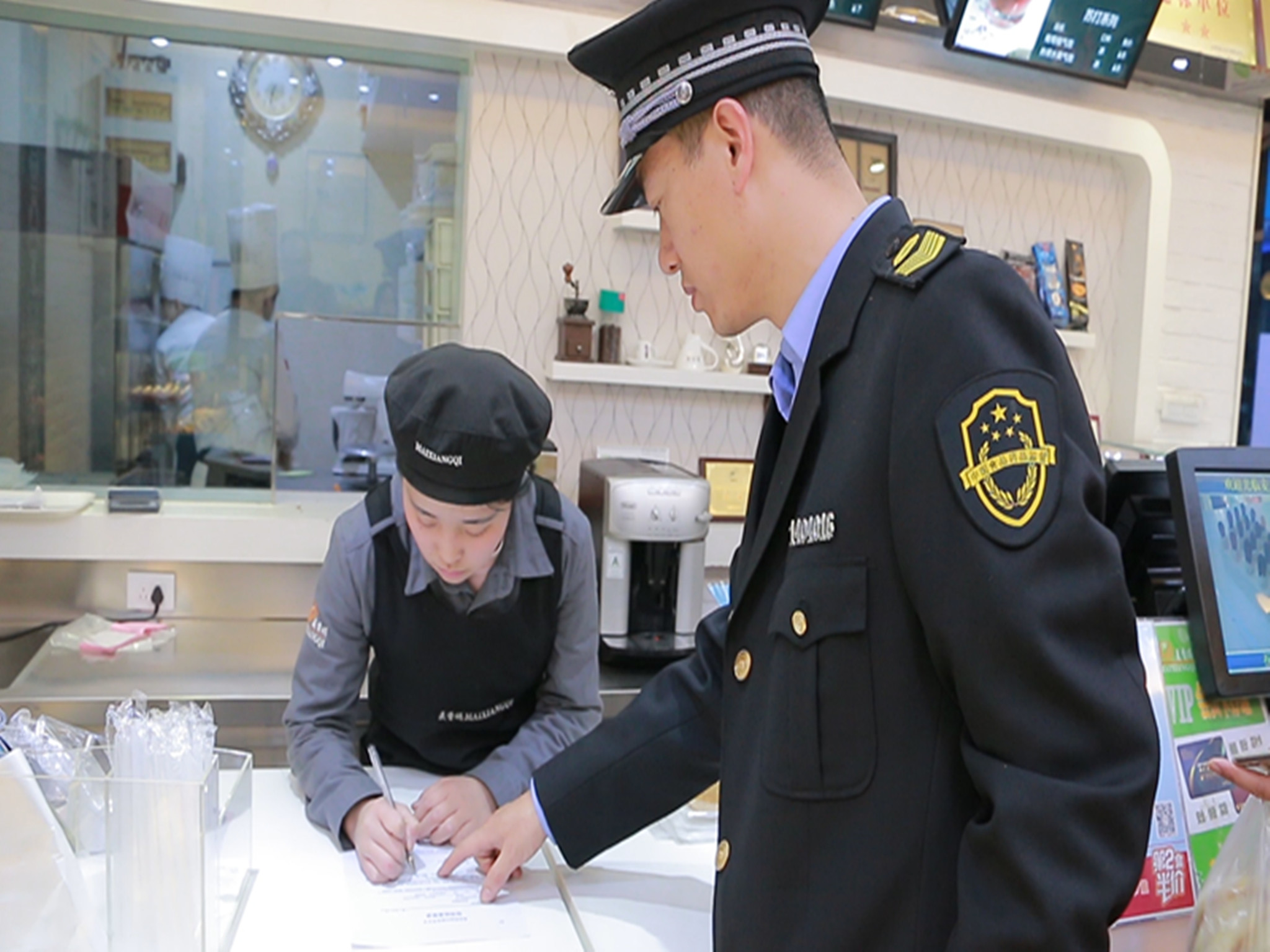 图十:古交市食药监局执法人员认真检查商店台账及索证索票情况。